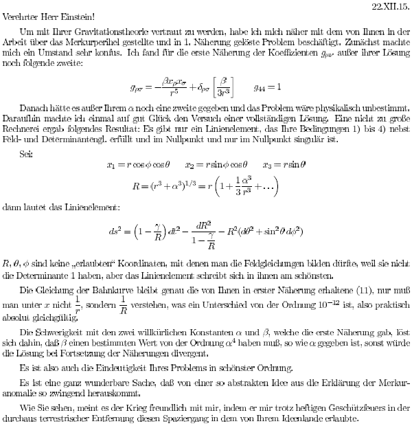 22.XII.15. Verehrter Herr Einstein! XXXUm mit Ihrer Gravitationstheorie vertraut zu werden, habe ich mich näher mit dem von Ihnen in der Arbeit über das Merkurperihel gestellte und in 1. Näherung gelöste Problem beschäftigt. Zunächst machte mich ein Umstand sehr konfus. Ich fand für die erste Näherung der Koeffizienten gμν auβer ihrer Lösung noch folgende zweite: