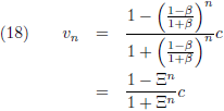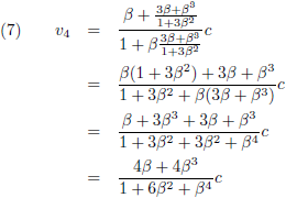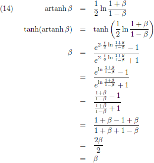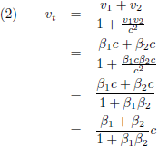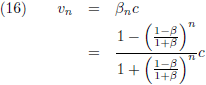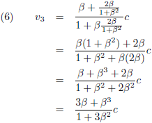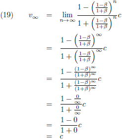 We kunnen doen wat we willen, maar uiteindelijk zullen we nooit de lichtsnelheid bereiken. Ook al zou iedere trap op de een of andere wonderbaarlijke manier een voortstuwing geven van β = 0.999999 c, dan nog zou het eindresultaat na heel veel trappen een fractie onder de lichtsnelheid blijven. Weliswaar zien we dat wel in na al het voorgaande gereken, maar dit is daarom nog geen waterdicht wiskundig bewijs. Is er een manier om dit anders aan te pakken? Tijdens de uitleg van paragraaf 4 van het artikel van Einstein over de algemene relativiteitstheorie kwam ik op een gegeven moment met deze vergelijking: