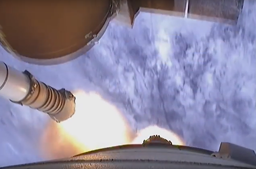 De eerste trap wordt afgestoten en de tweede trap wordt ontstoken.