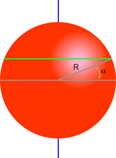 en tevens definieer ik een hoek α tussen dit bandje en de ‘evenaar’ van de bol.