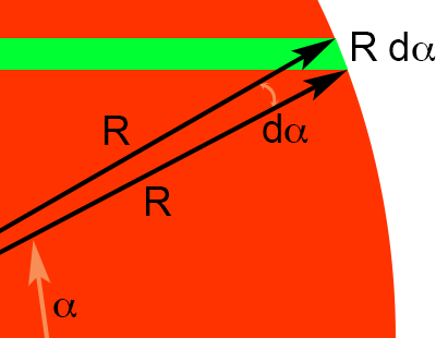 Het bandje is infinitesimaal hoog (of breed, net hoe je het noemen wilt) en sluit daardoor een infinitesimaal hoekje dα in.