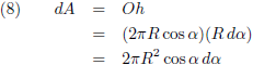 Dit infinitesimale stukje oppervlak kies ik als volgt, ik neem een horizontaal bandje van de bol (de rode lijn)