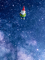 Ik laat vanaf grote afstand een baksteen in een zwart gat vallen en een kabouter, met een oranje mutsje, heeft zichzelf laten vastketenen aan de baksteen en zichzelf daarmee tot meebewegende waarnemer [Engels: comoving observer of free falling observer of rain observer (regendruppels zijn in vrije val als je de luchtweerstand verwaarloost)] gepromoveerd. Op het plaatje hiernaast zie je de kabouter, die zichzelf vrijwillig gemeld heeft, vastgeketend aan de baksteen. Hoeveel tijd verstrijkt er in zijn referentiekader, zijn referentiestelsel, zijn coördinatenstelsel, voordat hij de horizon van het zwarte gat passeert?