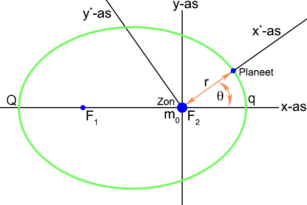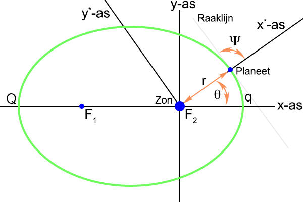 Indien ik de actuele hoekpositie van de planeet meet vanaf de referentie-as, deze hoek noem ik θ