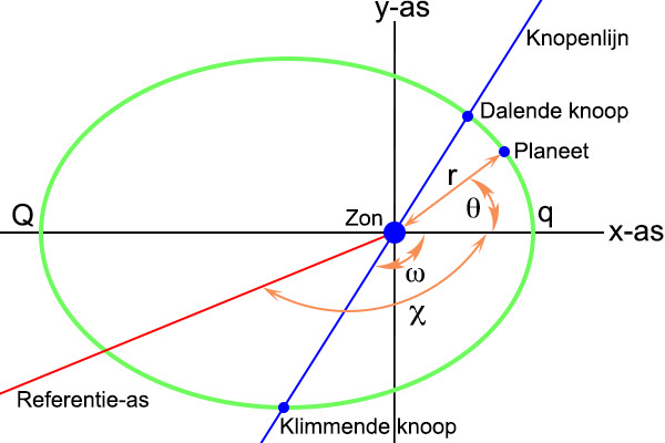 En de hoek χ geeft de positie van het