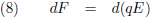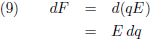 Per elektron moet ik een beetje kracht dF gebruiken om de afstand d te overbruggen en dat kost mij een beetje arbeid dW: