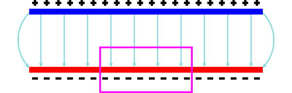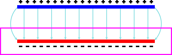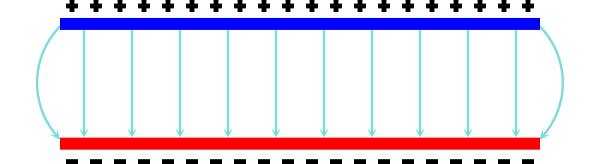 En er bevindt zich uiteraard een elektrisch veld tussen beide platen: