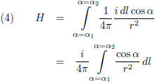 De bijdrage van de stroom i door het stukje dl aan het magnetische veld H in P is (in vectornotatie):
