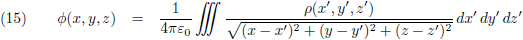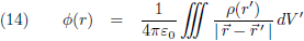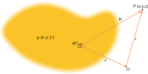 In vergelijking (14) heb ik de afstand tussen het punt P en het stukje volume dV (waar de lading zit) als een verschil