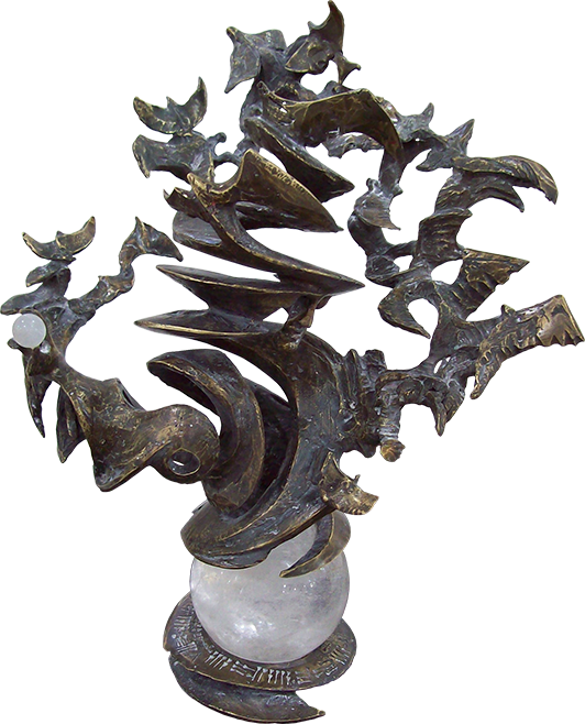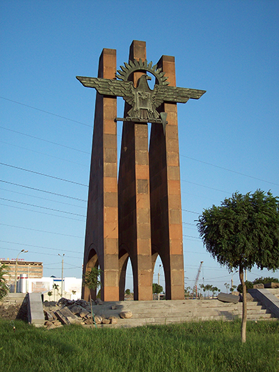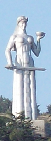 Ik fiets eerst maar eens mijn neus achterna en ik arriveer daardoor vanzelf bij één van de dit-moet-je-gezien-hebben plaatsen: het cascade complex. Meer dan 500 traptreden brengen je bovenaan bij een monument. Overzichtsplaatjes op internet zien er indrukwekkend uit, maar van dichtbij is het een heel stuk minder. De trappen gaan nog wel, maar vooral de omgeving van het monument verkeert in slechte staat. Het wemelt van de (zeer) moderne kunst, maar daar moet je dan uiteraard wel van houden (een stoplicht, een met zilverpapier beplakte auto, enzovoort, een leeuw gemaakt van banden vond ik wel mooi). Bovenaan heb je een goed uitzicht over de omgeving en daar zie ik: het standbeeld van Moeder Armenië.